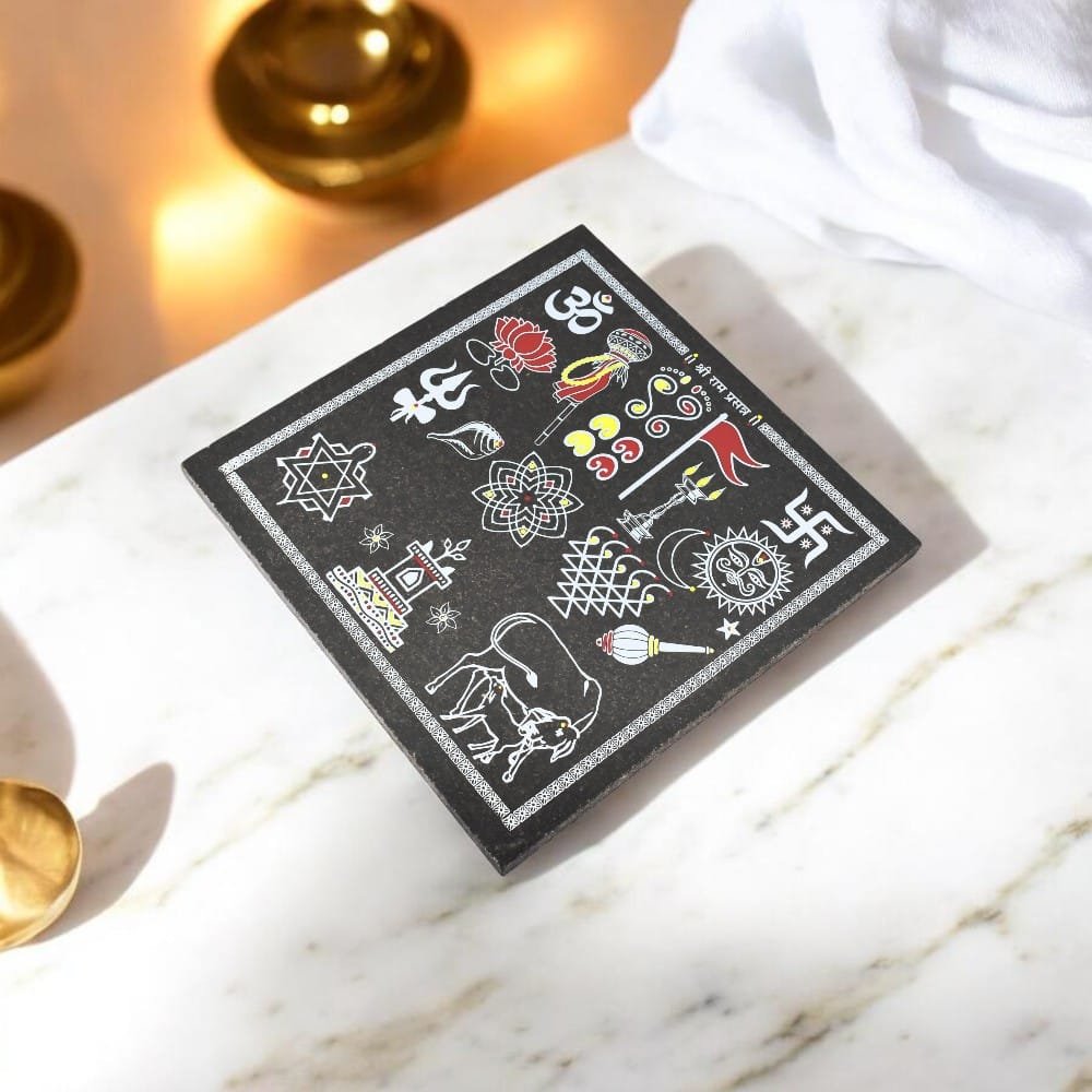 This is a spiritual décor piece crafted on premium granite, thoughtfully designed for home entrances, pooja rooms, and other sacred spaces. With its compact 12 × 12 inch size, it adds a touch of elegance without occupying much space, making it easy to place in a variety of settings while maintaining a refined and auspicious presence.